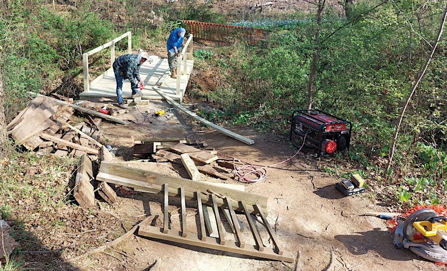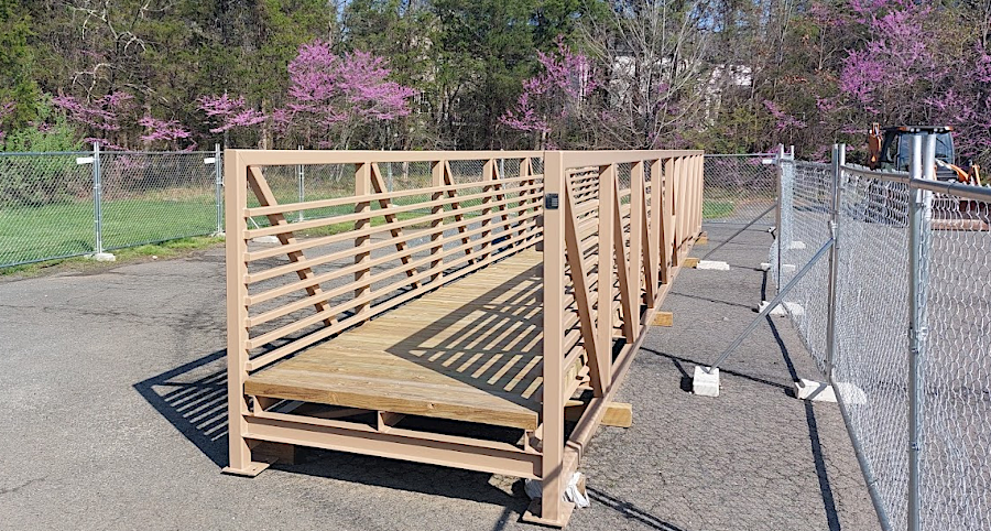 Prince William Department of Parks and Recreation is making quick progress in replacing a trail bridge on Broad Run Trail next to Linton Hall Road. (Photo taken April 4, 2026.)