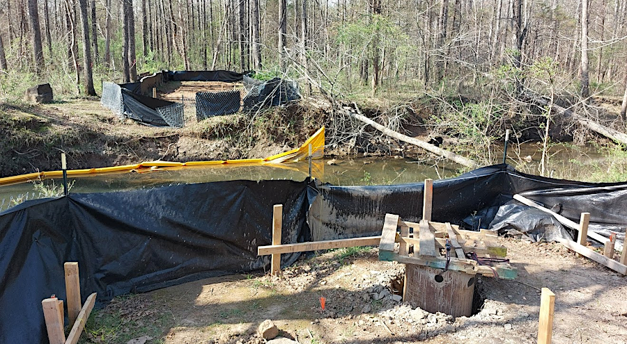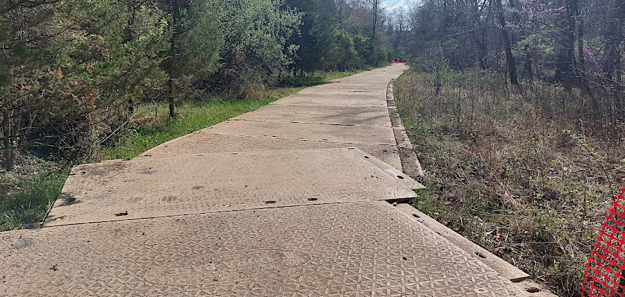 Replacing the bridge over Rocky Run that washed out years ago (next to Kingsbrooke further upstream) is taking far longer. Winter weather, especially a month of snow, delayed installation of a bridge structure previously delivered. Special pads are in place for transporting the bridge from the road to the stream.