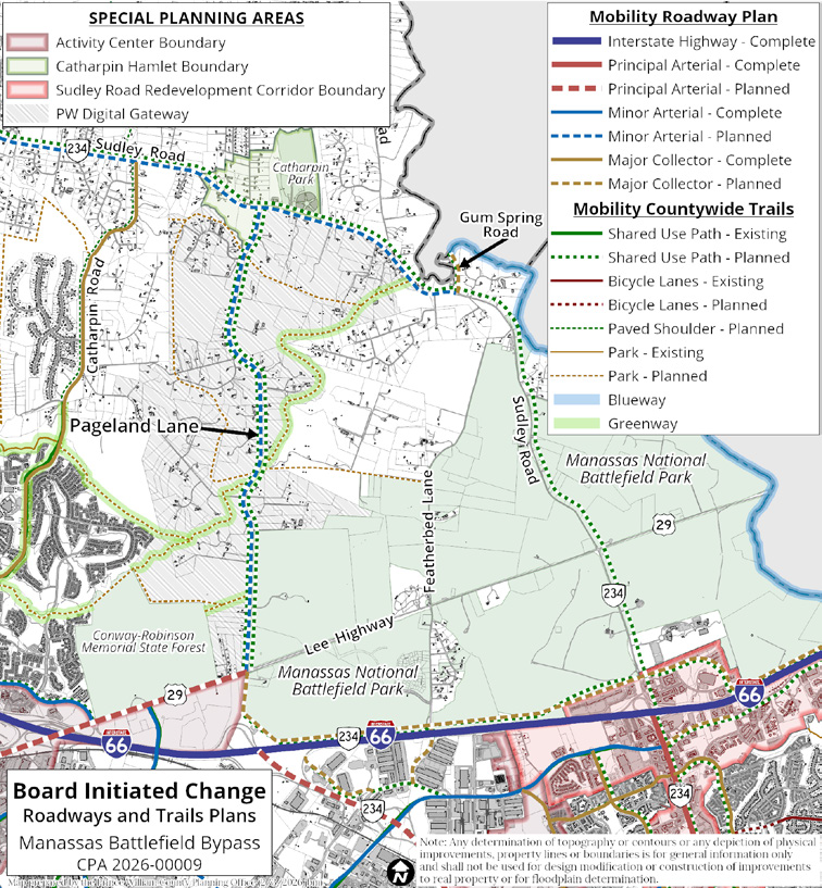 Proposed changes include deleting the Manassas Battlefield Bypass and the extension of Heathcote Boulevard to Antioch Road. Paved Shared Use Paths parallel to those roads would also be deleted.