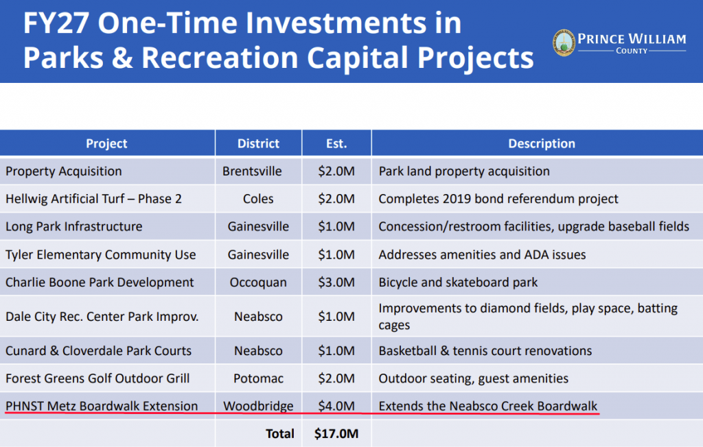 The FY27 draft budget also includes a $4 million one-time addition for extending the Neabsco Boardwalk through the Metz Wetland to Leesylvania State Park. The extension would improve a segment of the Potomac Heritage National Scenic Trail.
