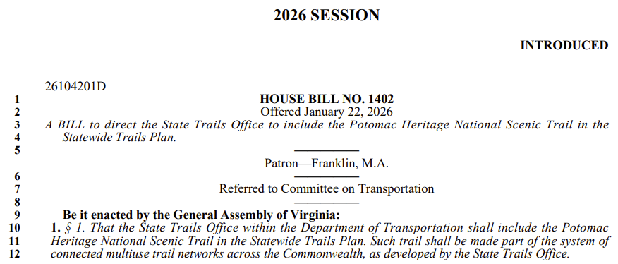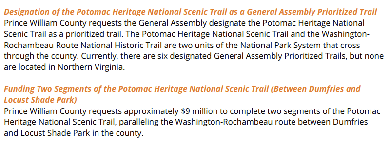 The funding request is to help build segments of the Potomac Heritage National Scenic Trail (PHNST) that follow the route of George Washington and the Compte de Rochambeau in 1781 as they marched to Yorktown. The 250th anniversary (SemiQuincentennial) of that event is expected to attract tourists in 2031.