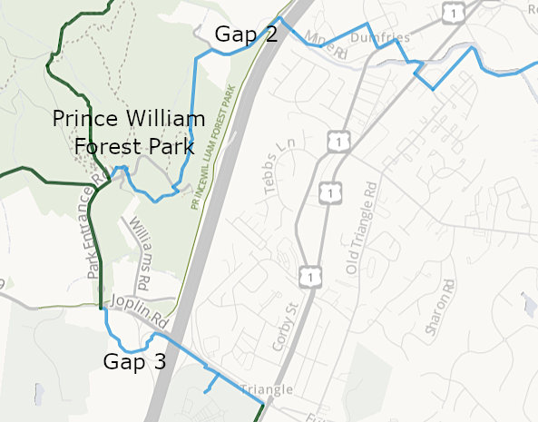 Funding is needed to close Gap 2 and Gap 3, as identified in a Federal Land Access to Parks (FLAP) study completed in 2025 . Building the PHNST through Gap 2 will re-connect Dumfries to Prince William Forest Park, a link that was severed when I-95 was completed in the mid-1960’s. Gap 3 will provide a safe connection south of the park to the trail network of the National Museum of the Marine Corps and to Locust Shade Park.